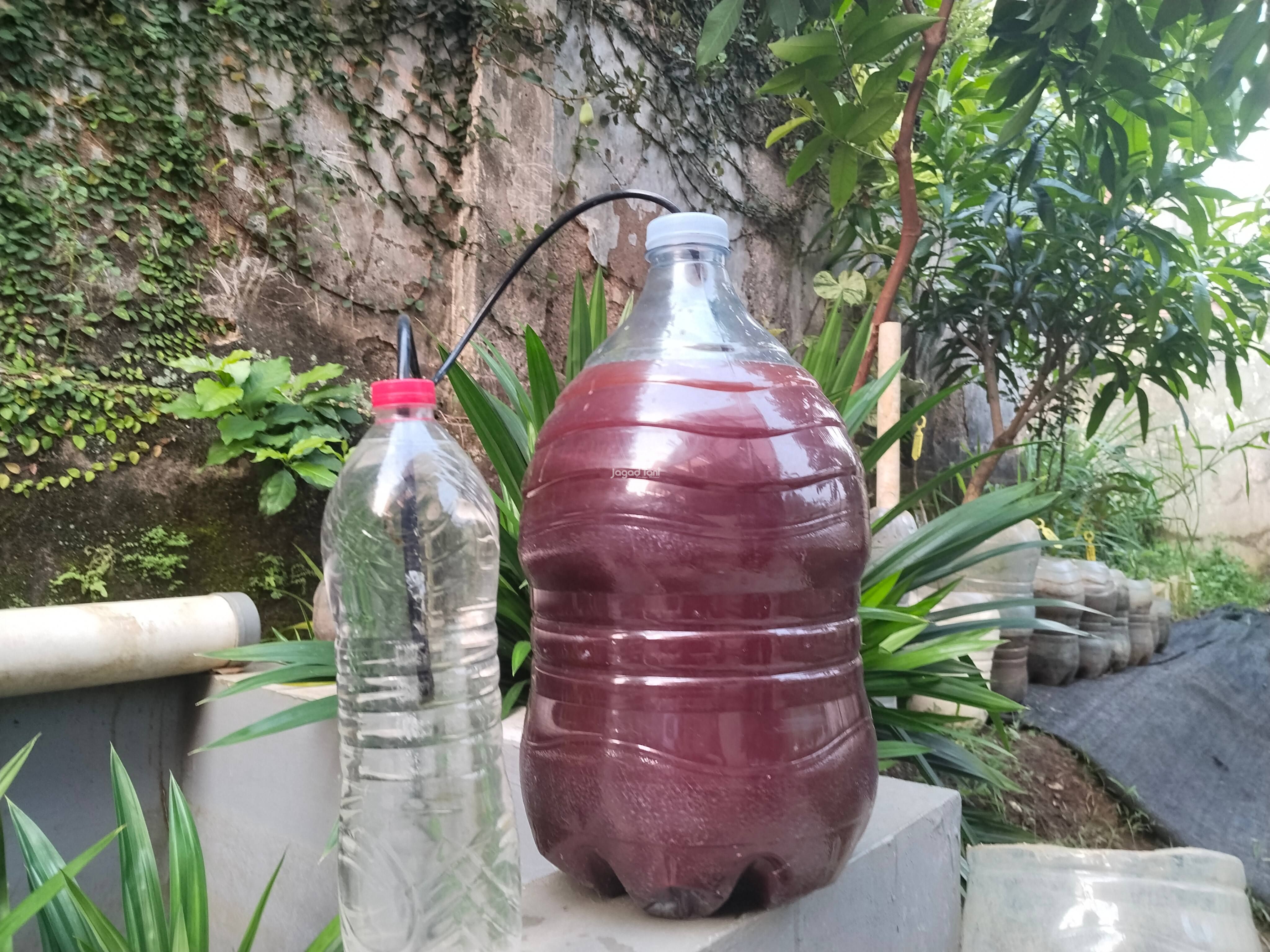Selama proses pembuatan, cairan tersebut akan menghasilkan gas. Untuk mengeluarkan agar tidak meledak, maka sebuah selang dimasukkan ke dalam galon fermentasi pupuk psb dan selang tersebut nantinya disalurkan ke dalam botol ataupun wadah yang berisi air, serta harus dibuka setiap harinya untuk mengeluarkan gas.
