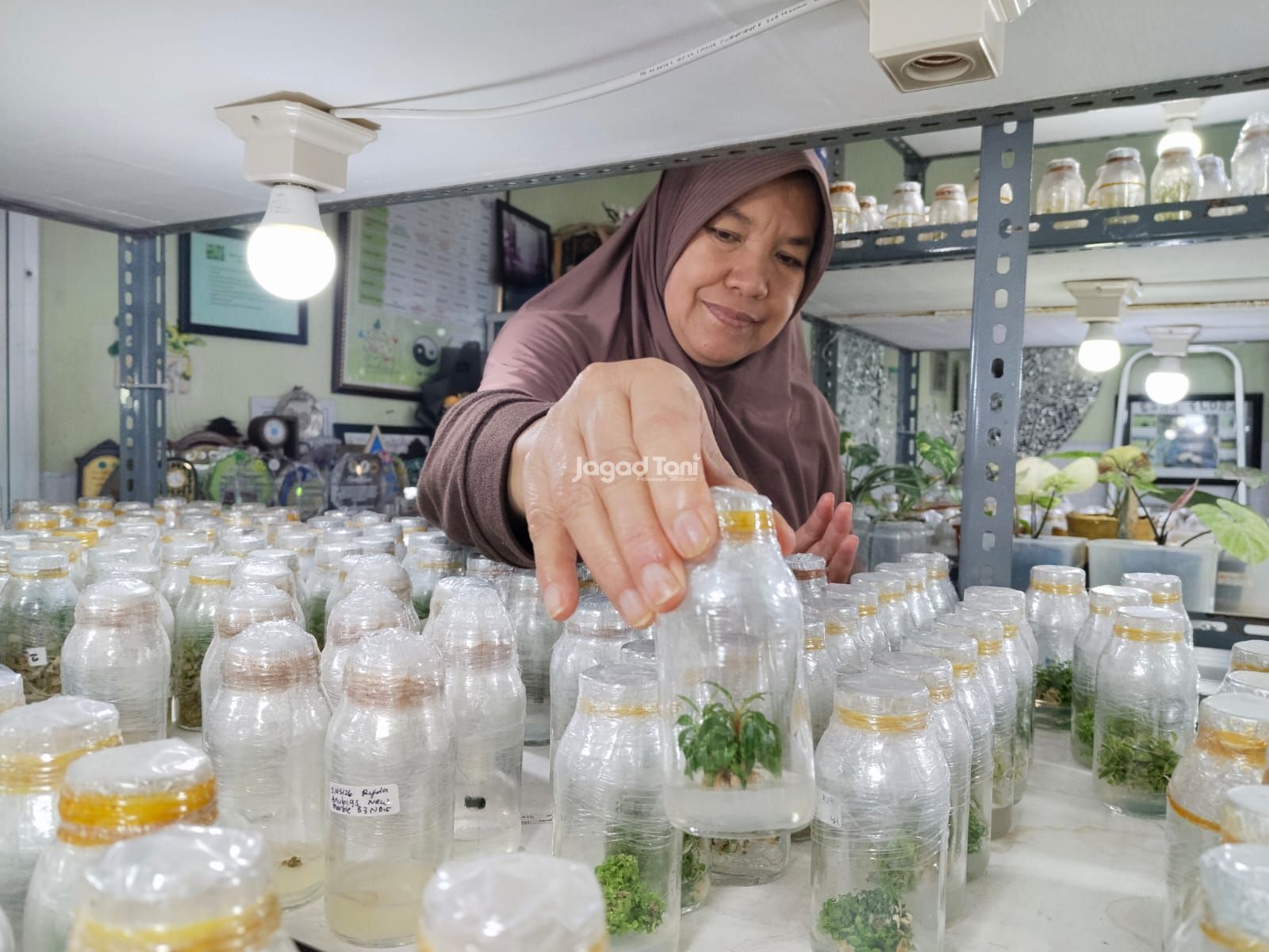 "Hapsiati sedang memindahkan botol kultur jaringan (Foto: Jagad Tani/Rahmat Iskandar Rizki)"