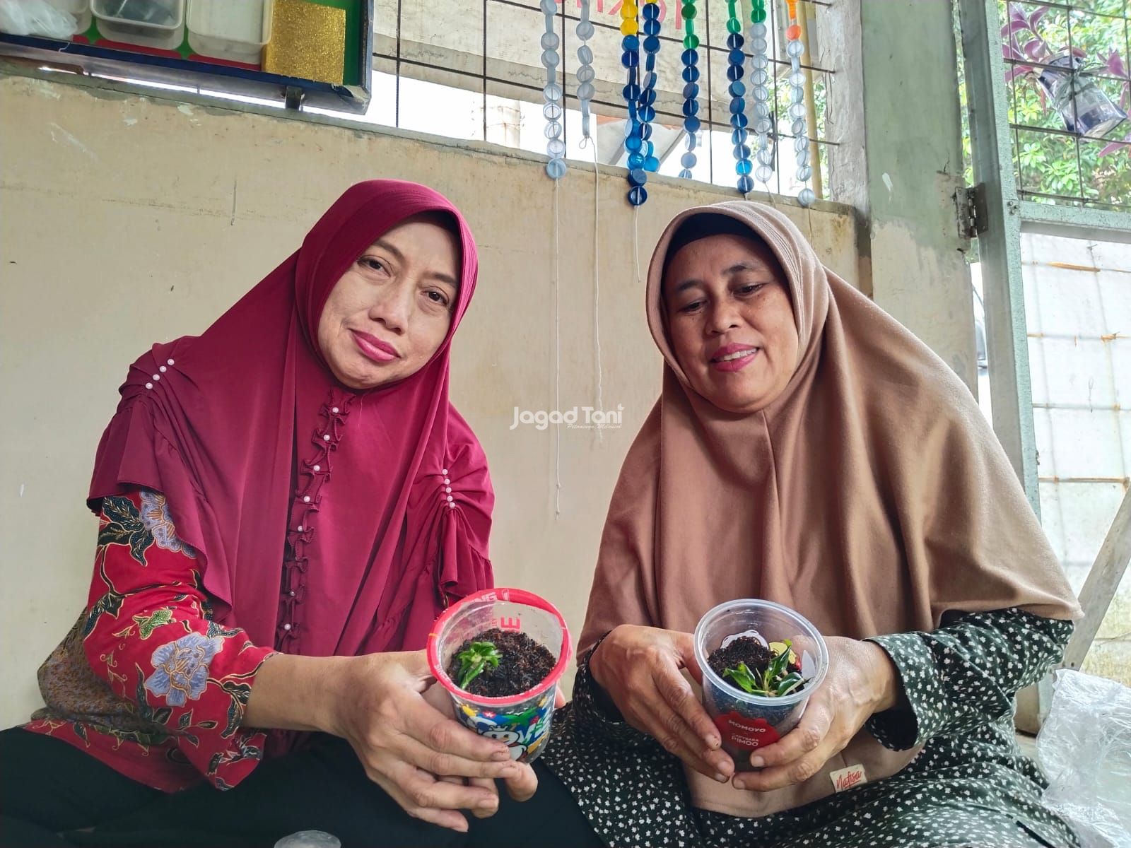 "Ibu-ibu anggota KWT menunjukkan bibit tanaman hasil dari kultur jaringan, yang baru dipindah tanam (Foto: Jagad Tani/Rahmat Iskandar Rizki)"
